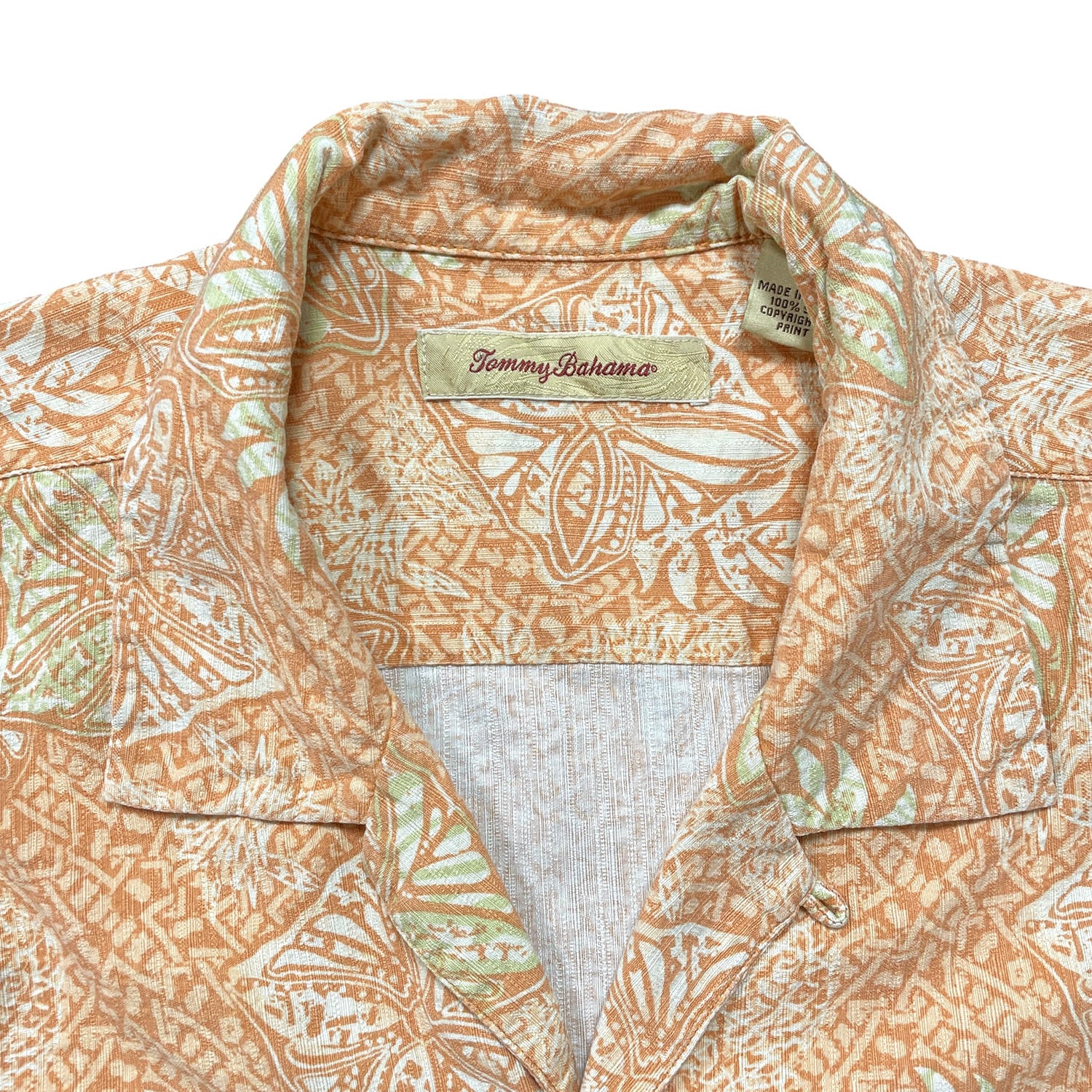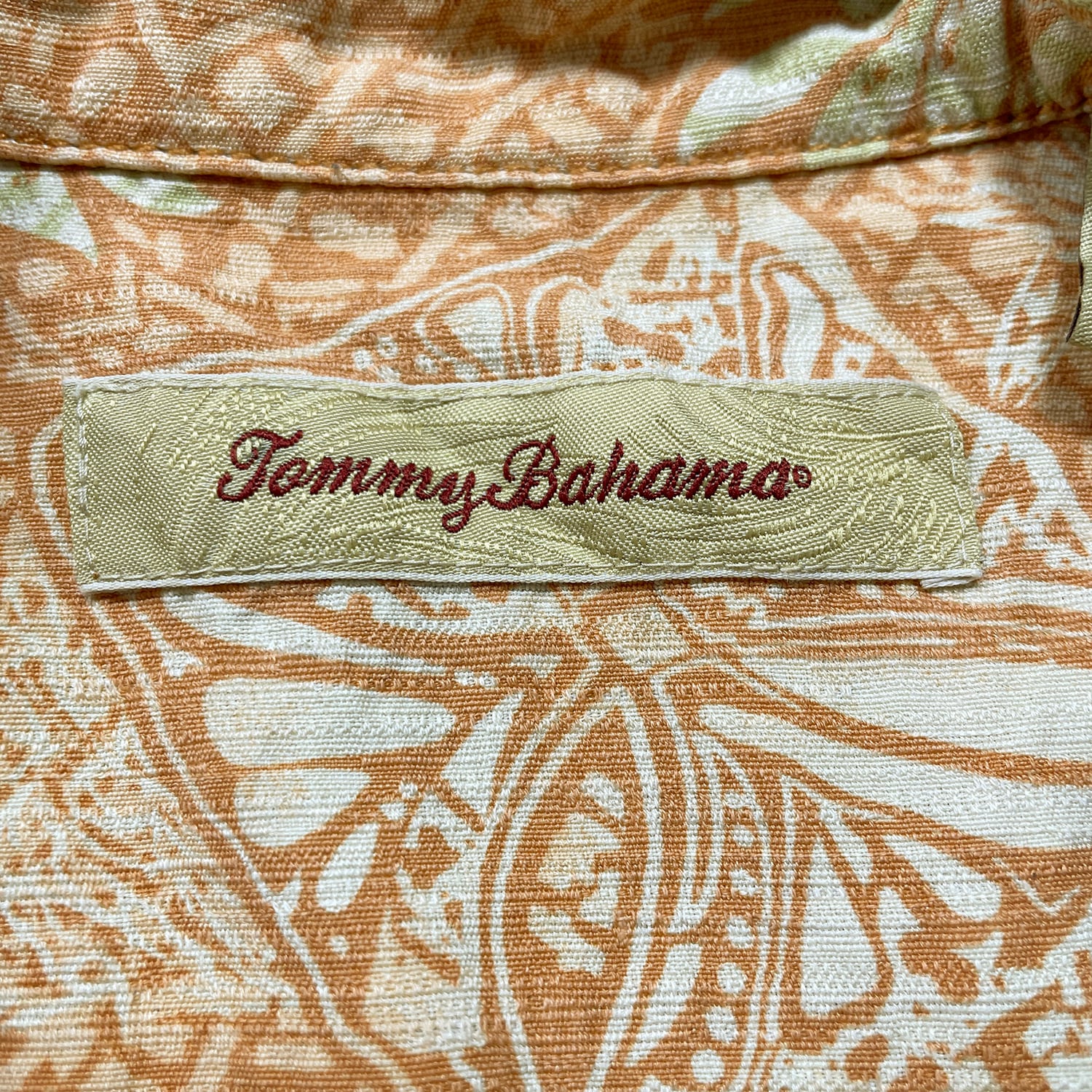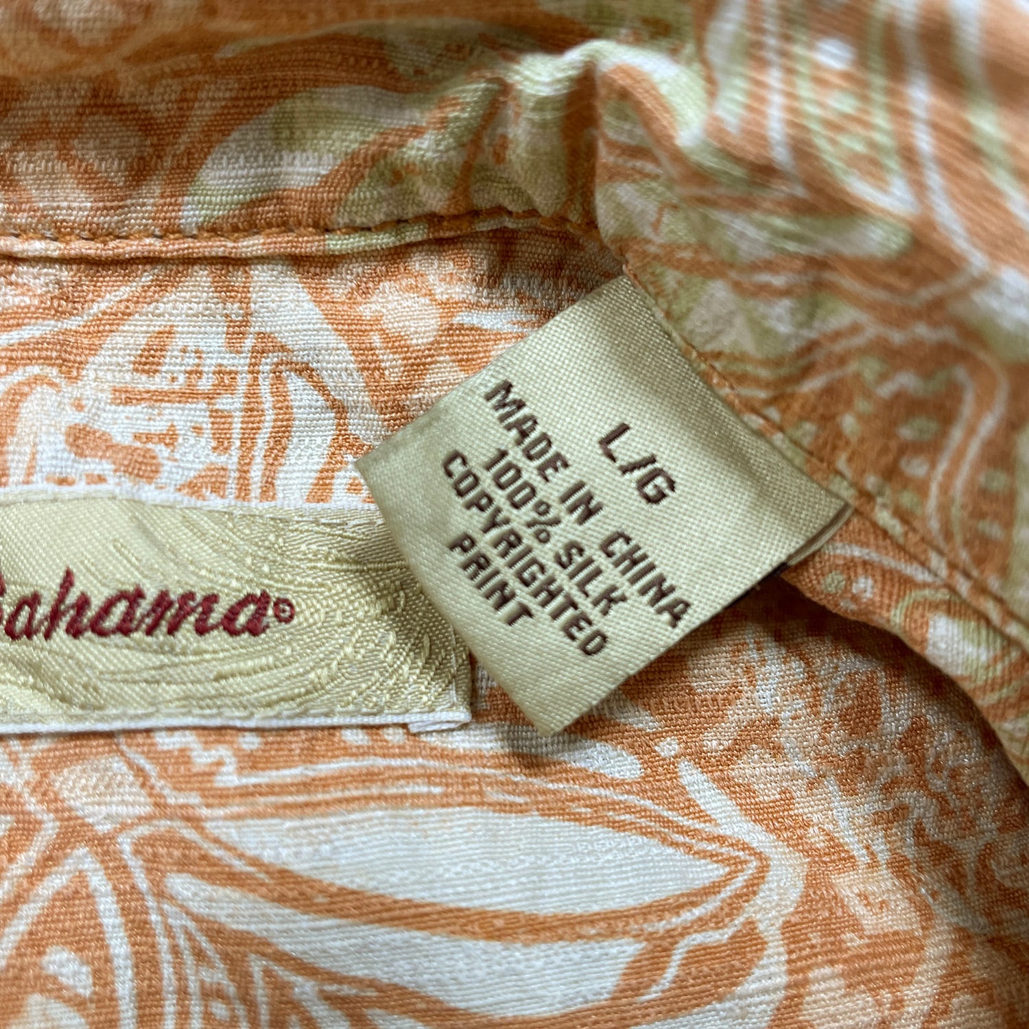 USA 古着 Tommy Bahama トミーバハマ シルク 開襟 アロハシャツ ハワイアンシャツ キャンプシャツ 幾何学柄 メンズL オレンジ BF3972