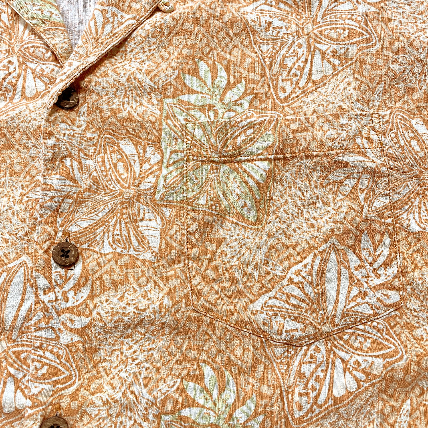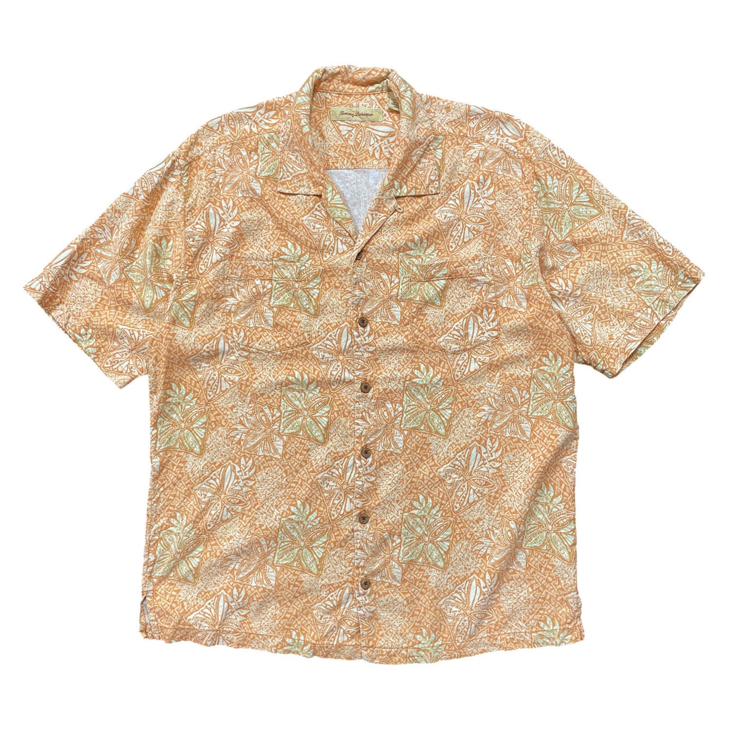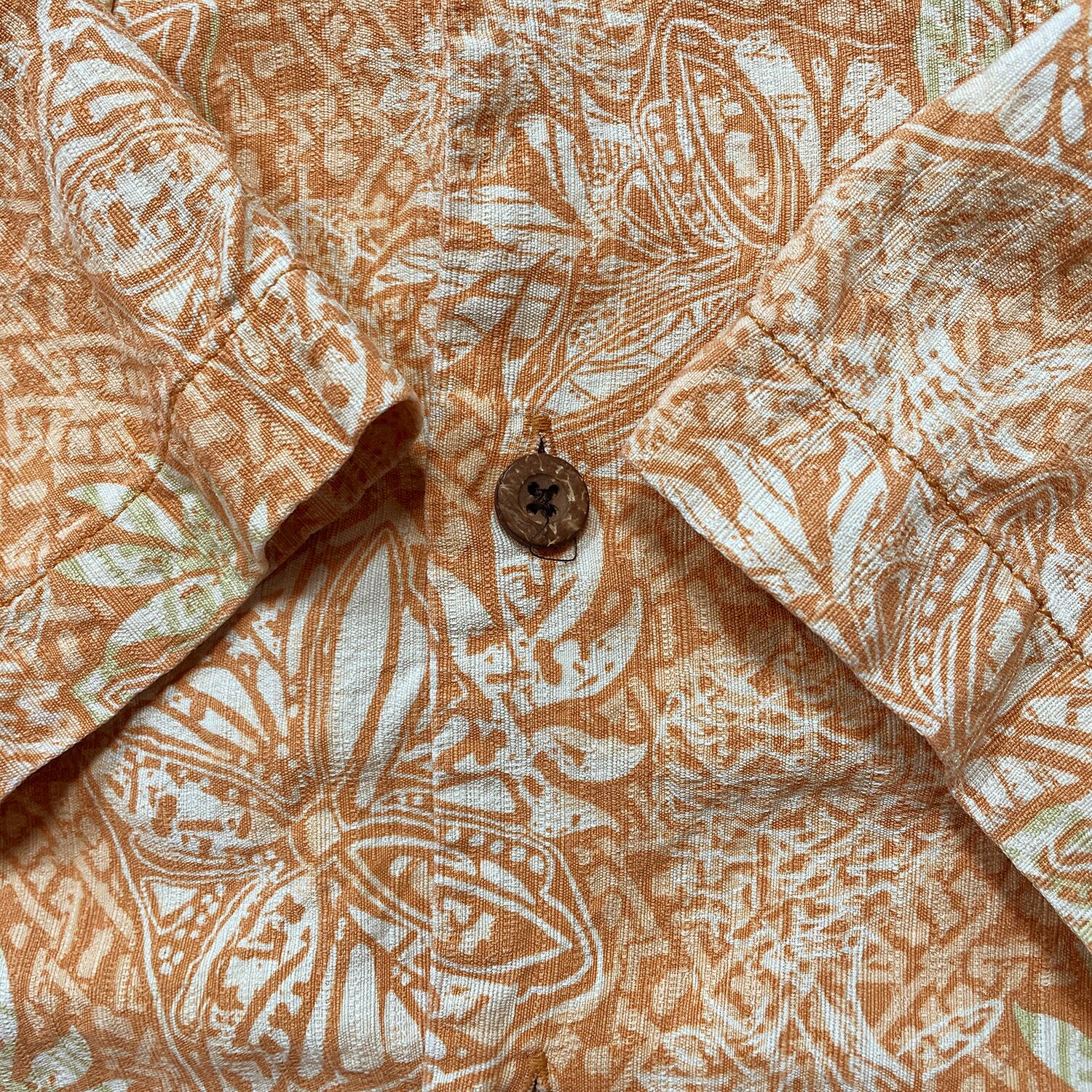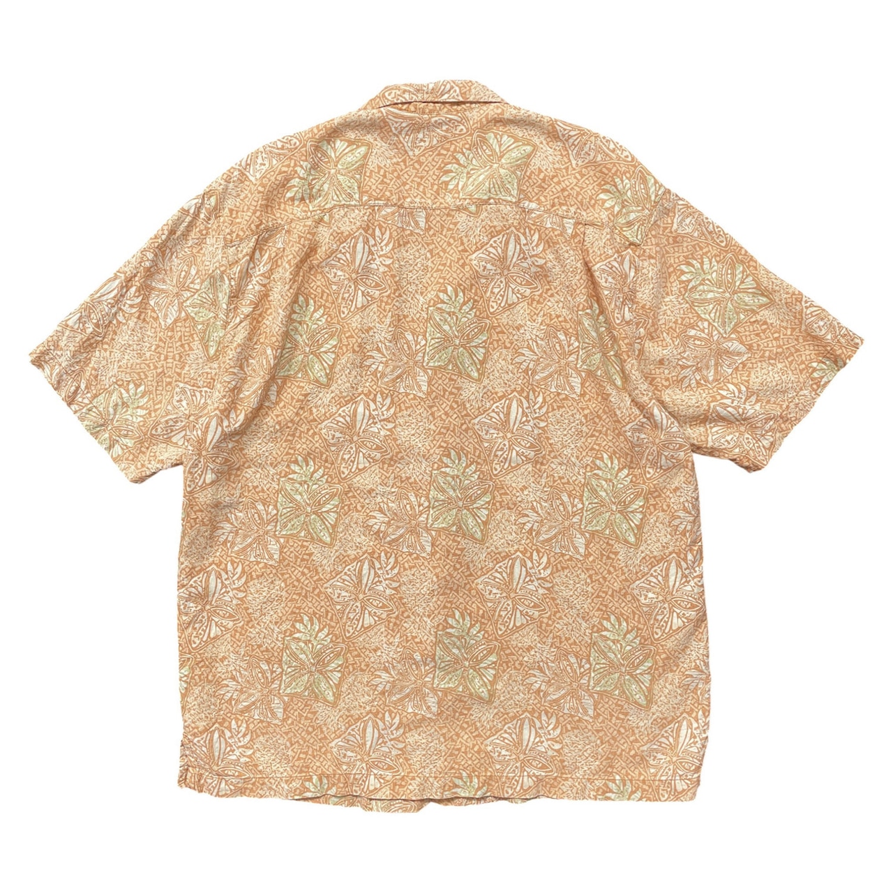 USA 古着 Tommy Bahama トミーバハマ シルク 開襟 アロハシャツ ハワイアンシャツ キャンプシャツ 幾何学柄 メンズL オレンジ BF3972