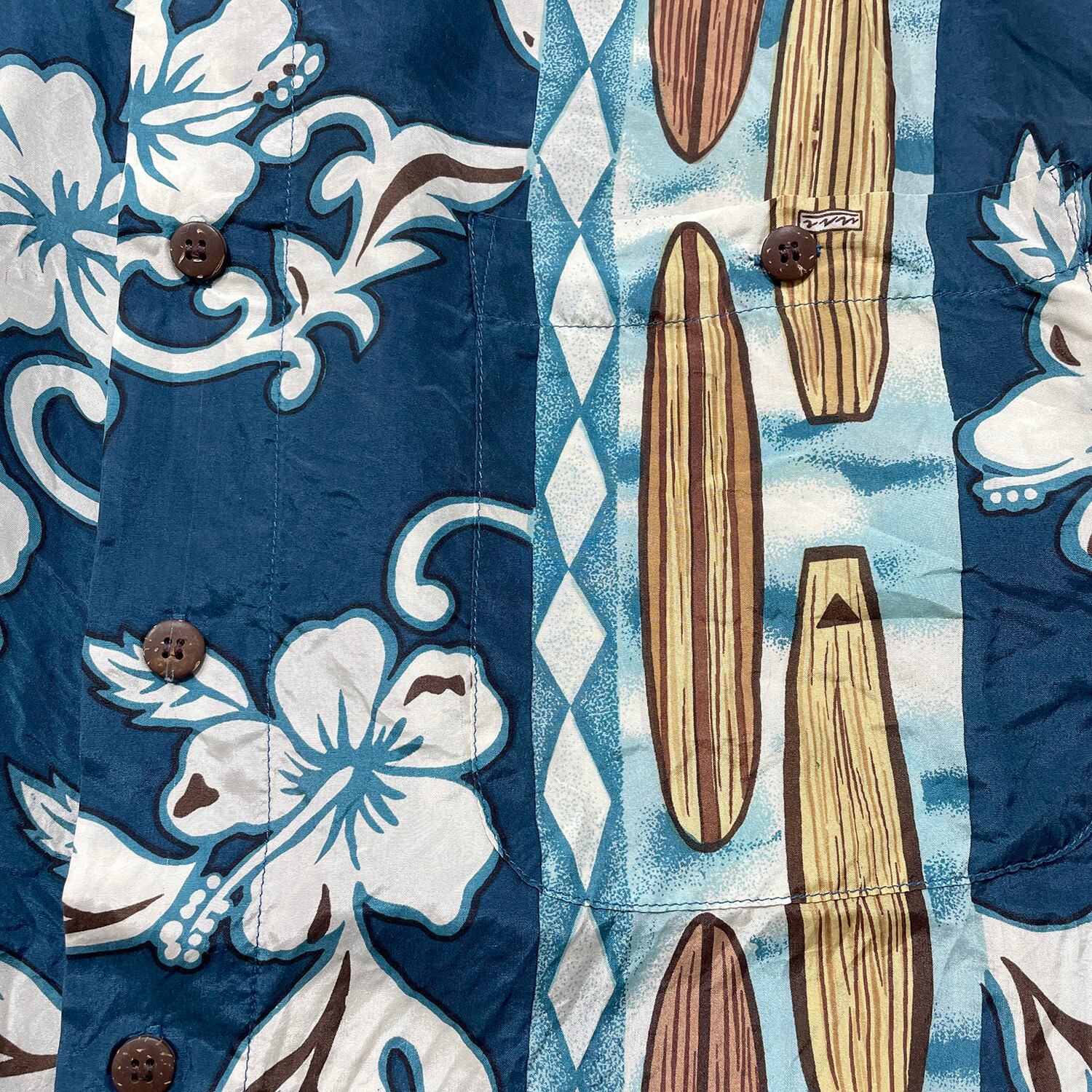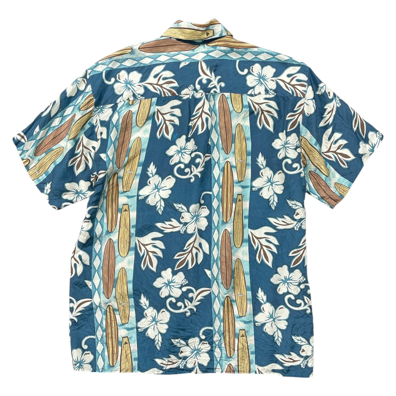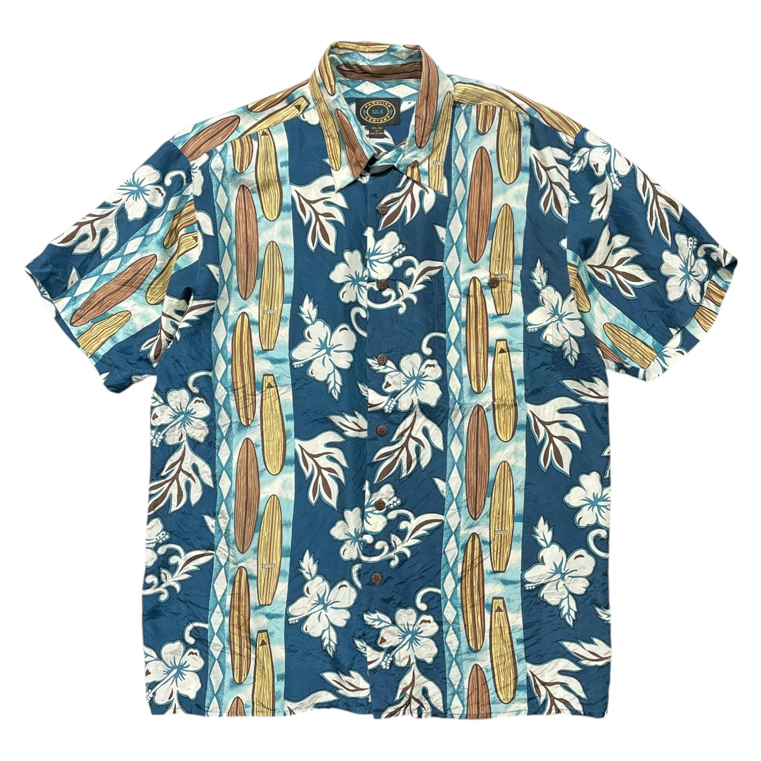 USA 古着 HAWAIIAN SILK COMPANY ハワイアンシルクカンパニー シルク アロハシャツ ハワイアンシャツ サーフボード柄 ハイビスカス柄 メンズM ネイビー BF3996