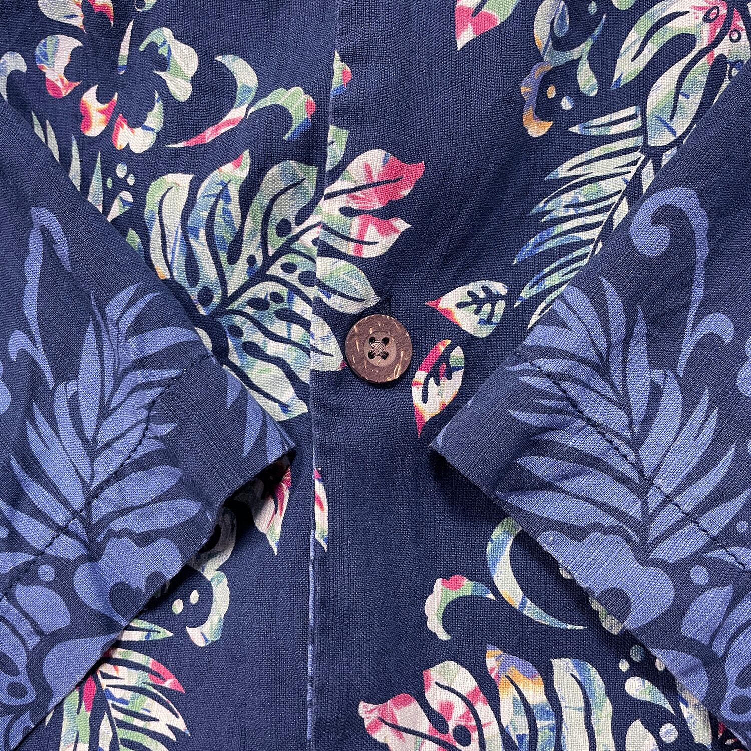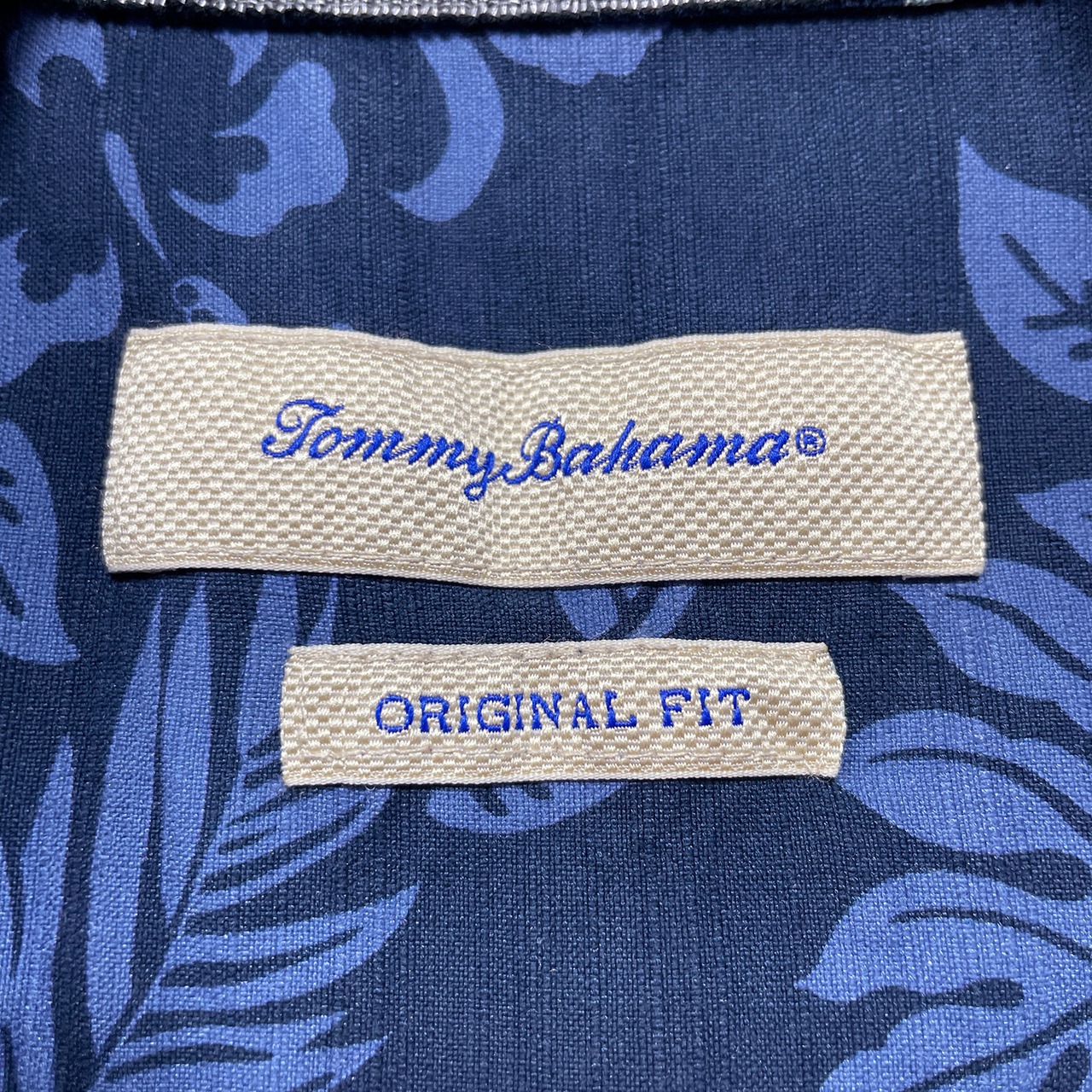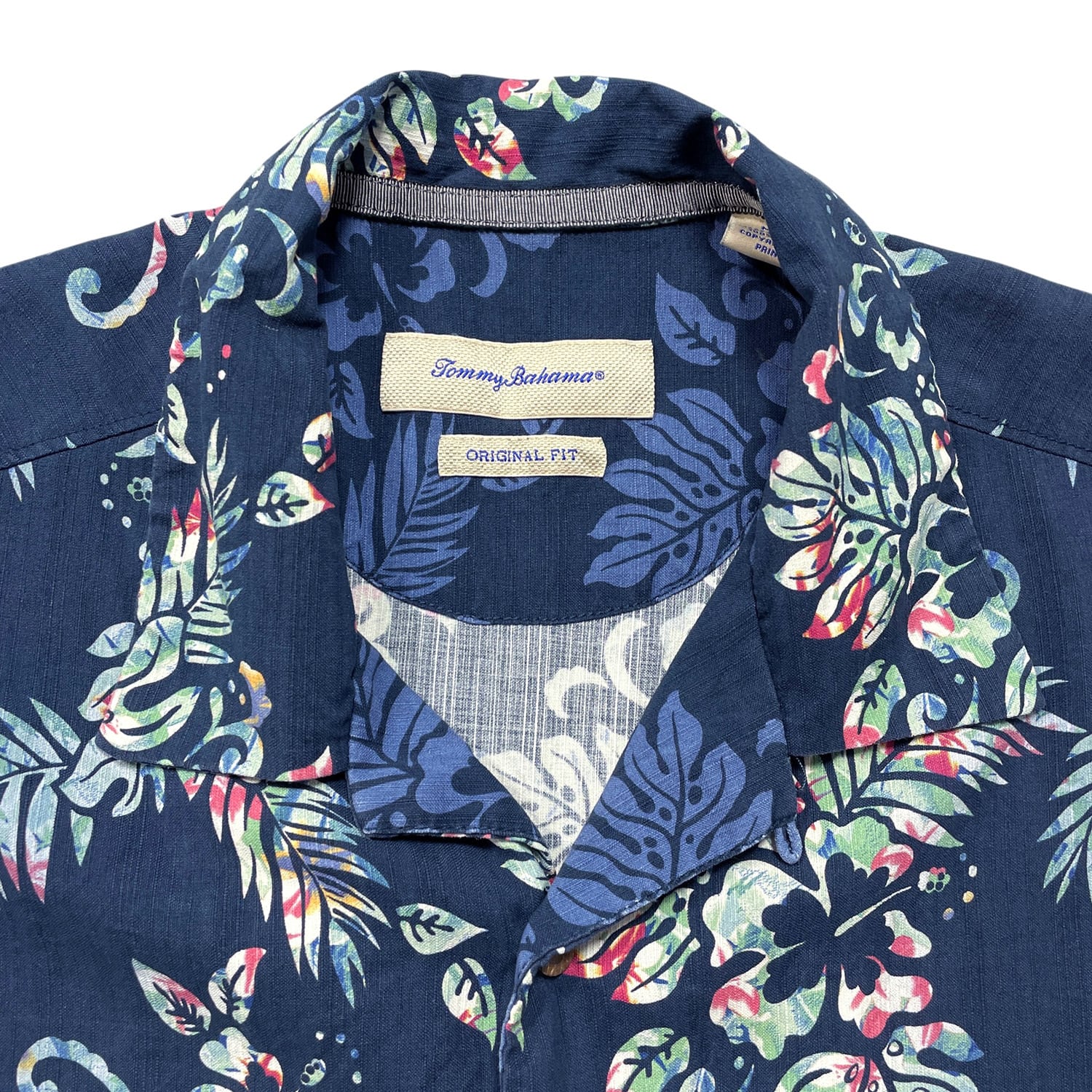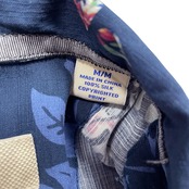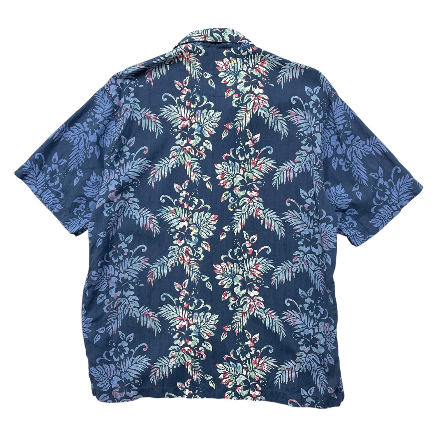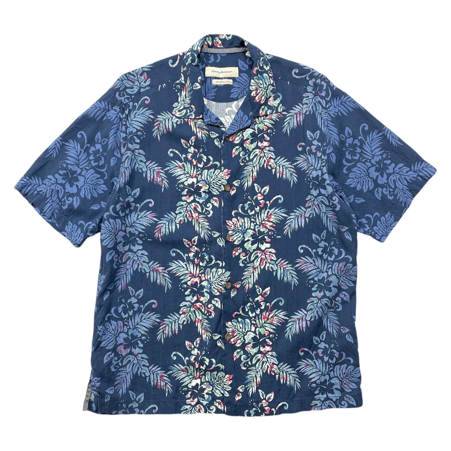USA 古着 Tommy Bahama トミーバハマ シルク 開襟 アロハシャツ ハワイアンシャツ キャンプシャツ ハイビスカス柄 リーフ柄 メンズM ネイビー BF4015