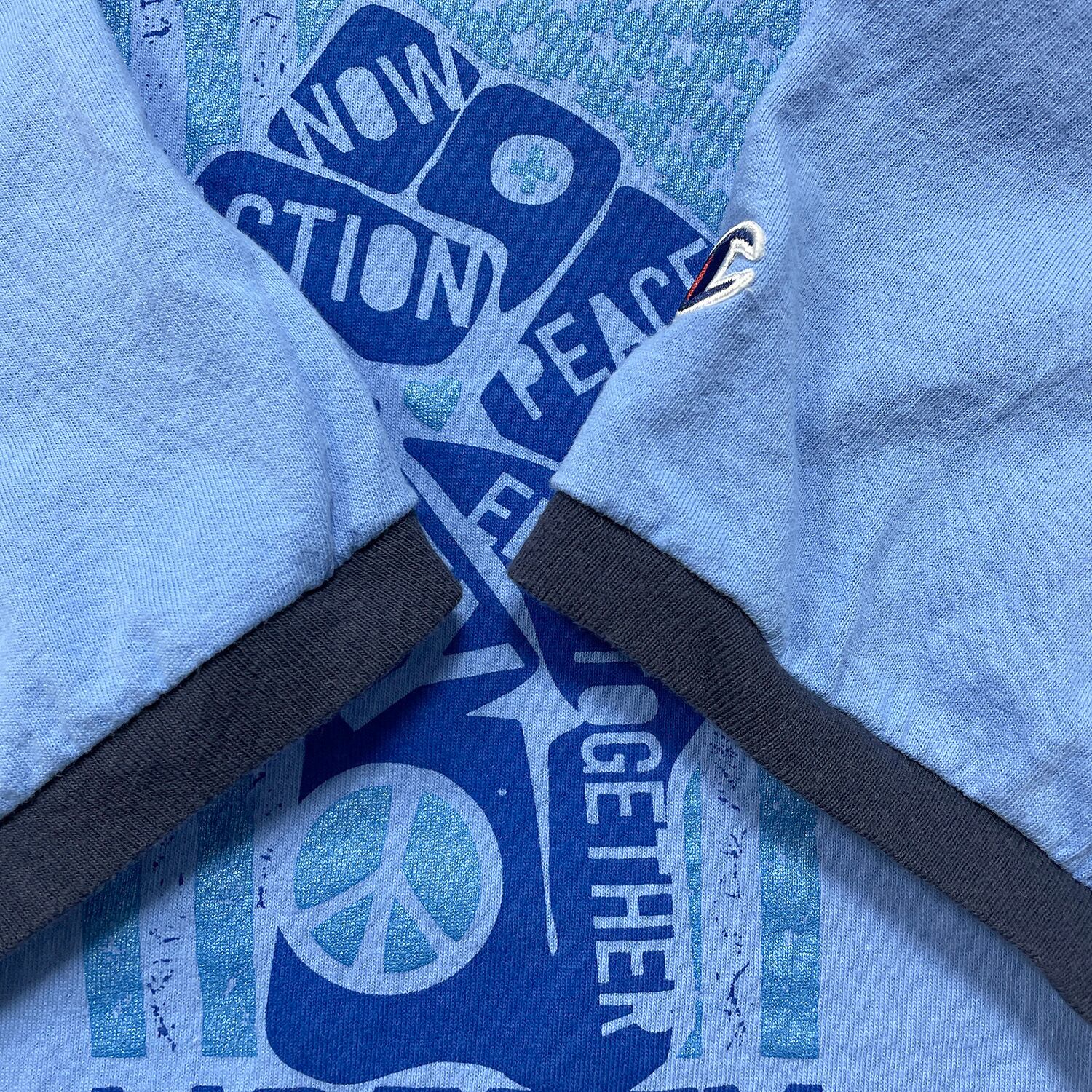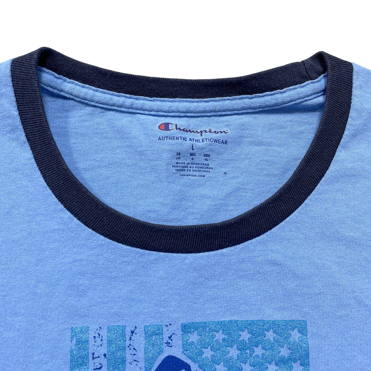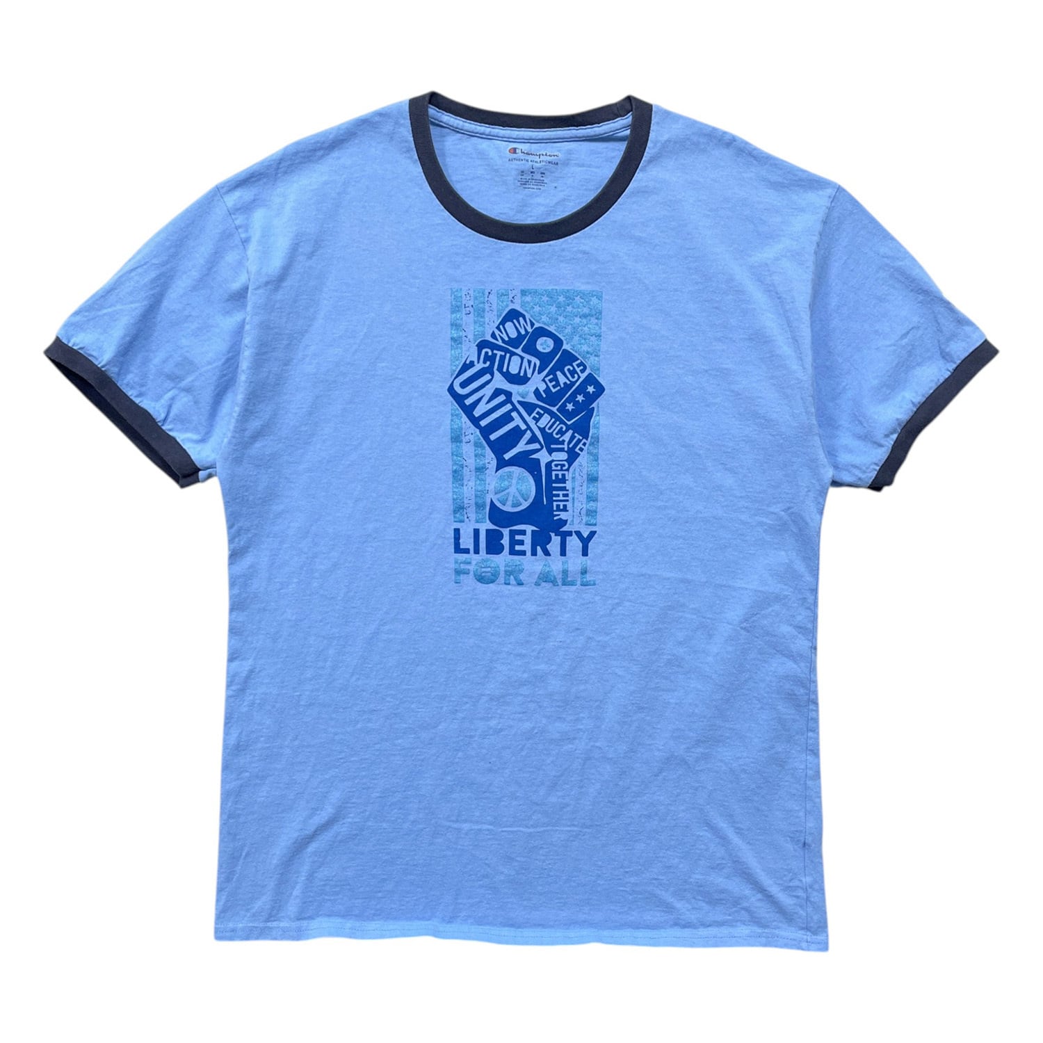 USA 古着 Champion チャンピオン LIBERTY FOR ALL クルーネック トリム リンガー Tシャツ プリント メンズL ブルー BA4931