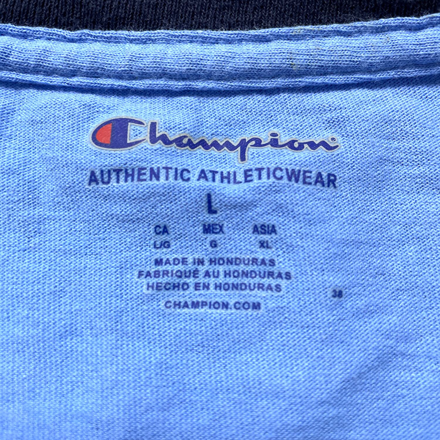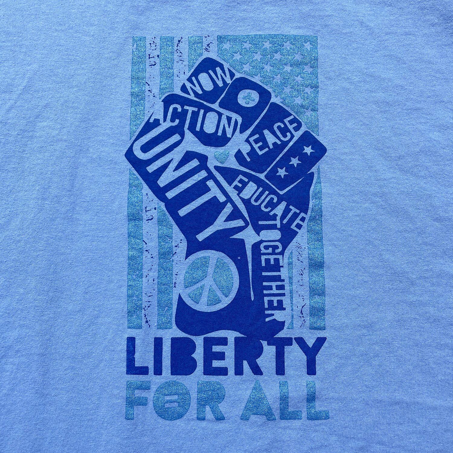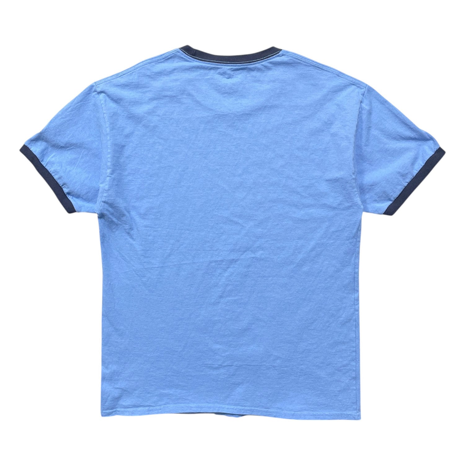 USA 古着 Champion チャンピオン LIBERTY FOR ALL クルーネック トリム リンガー Tシャツ プリント メンズL ブルー BA4931