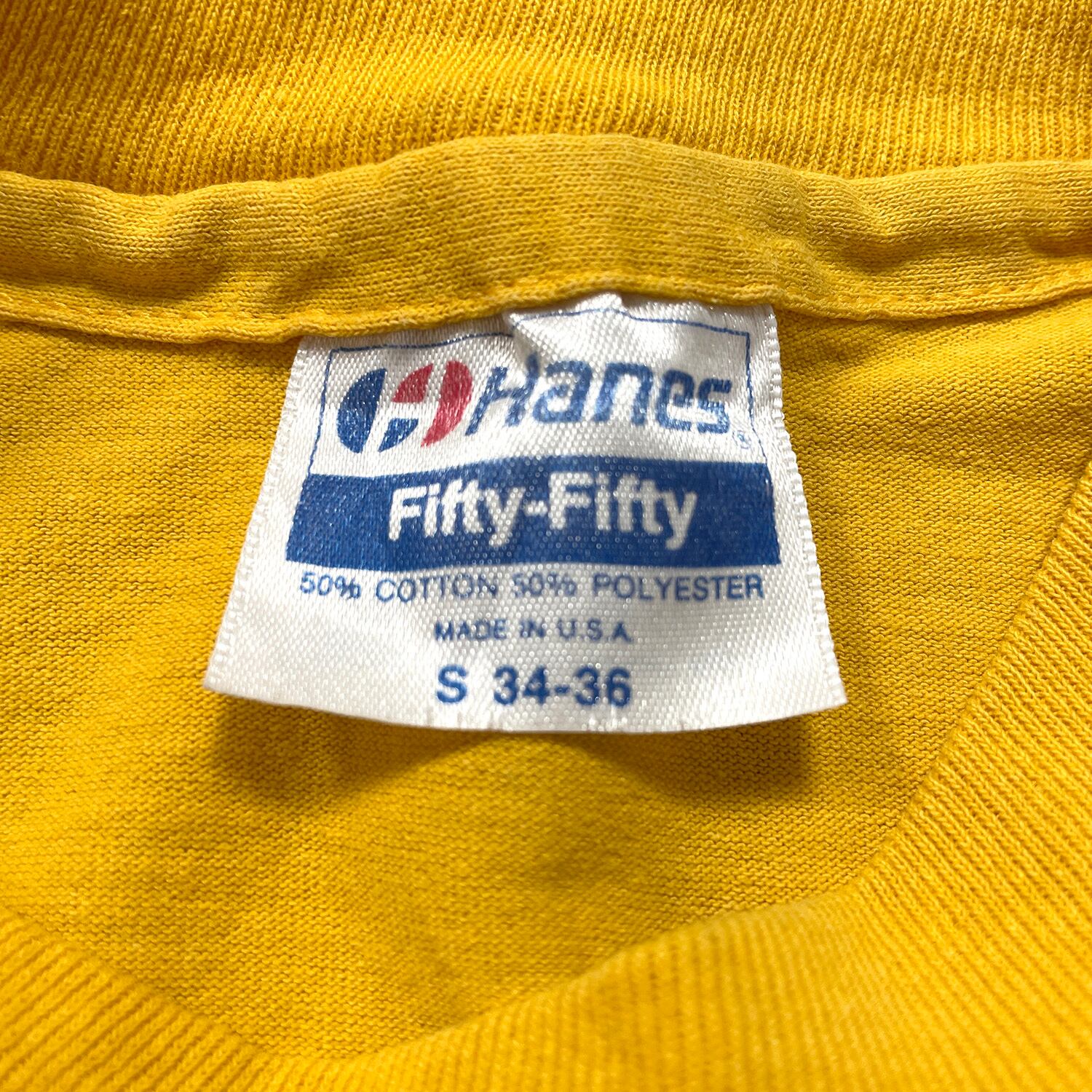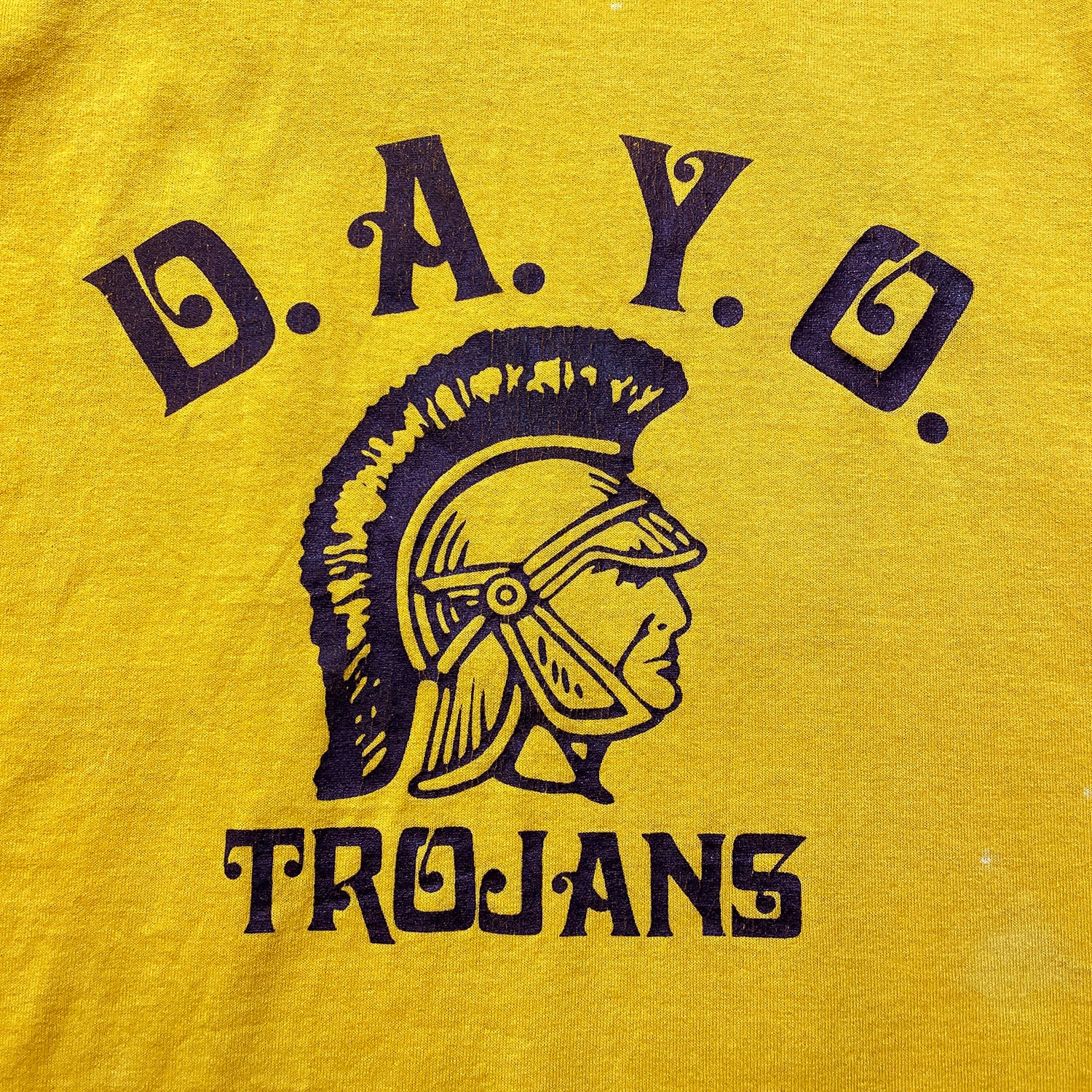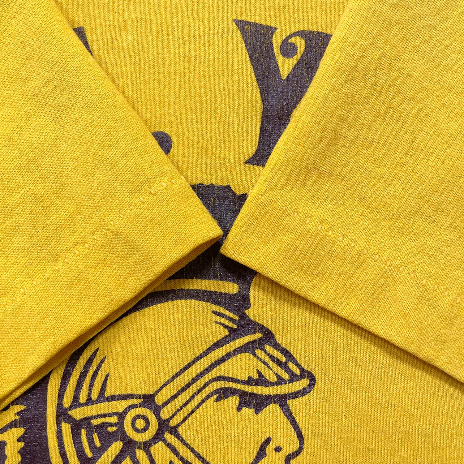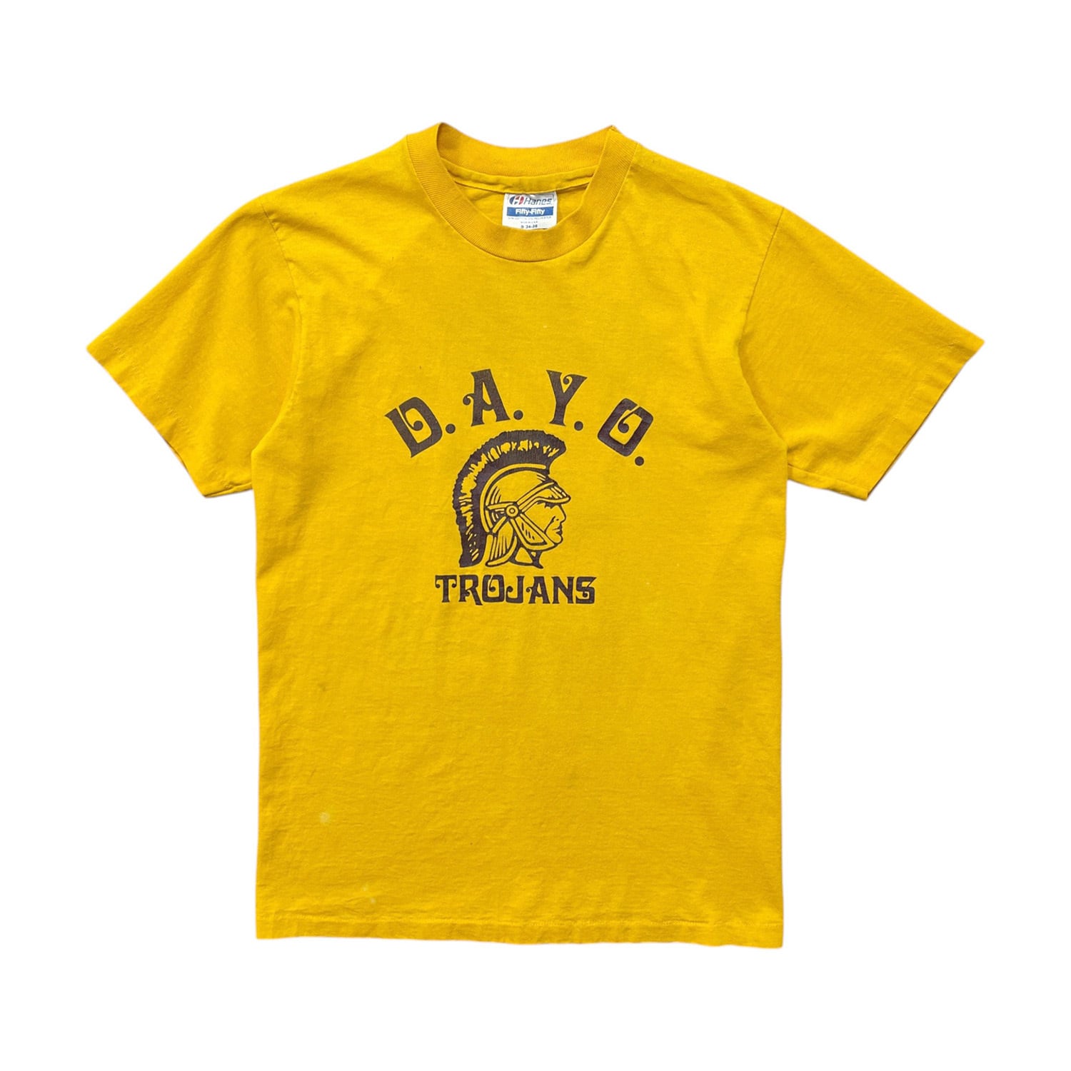古着 USA製 80S Hanes D.A.Y.O. トロージャンズ ヴィンテージ クルーネック Tシャツ プリント メンズS イエロー シングルステッチ BA4952