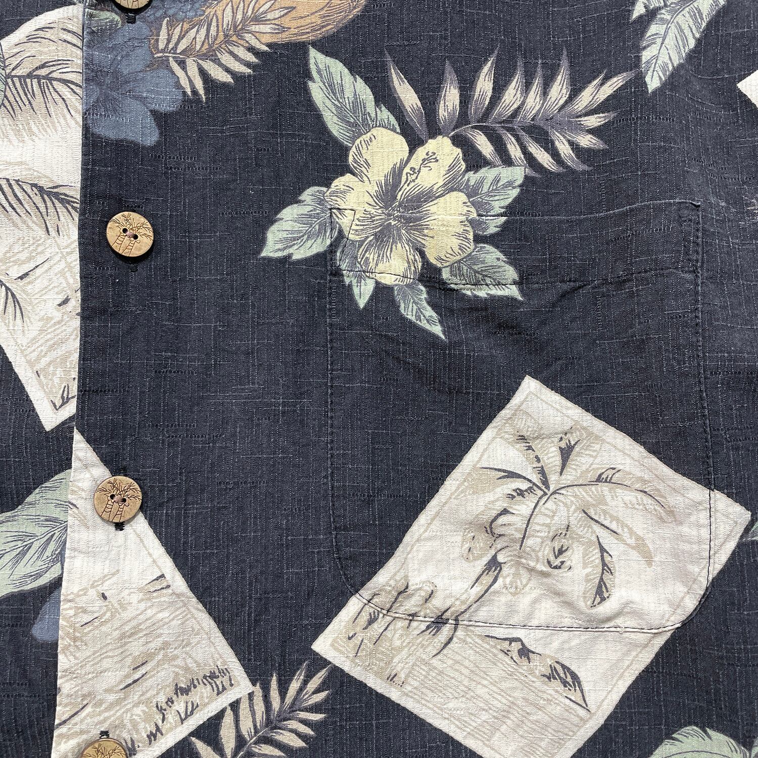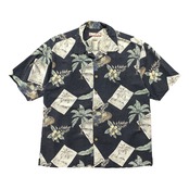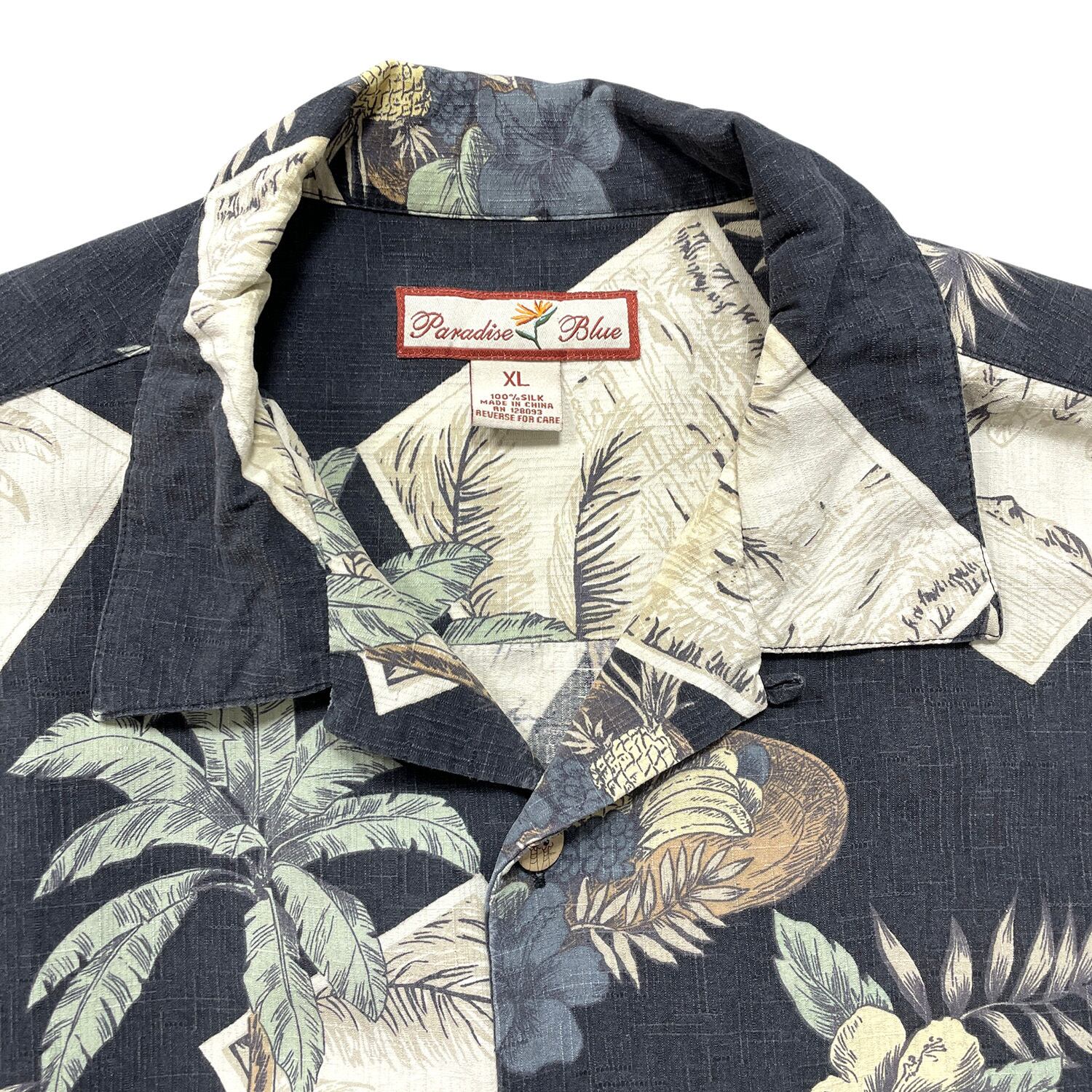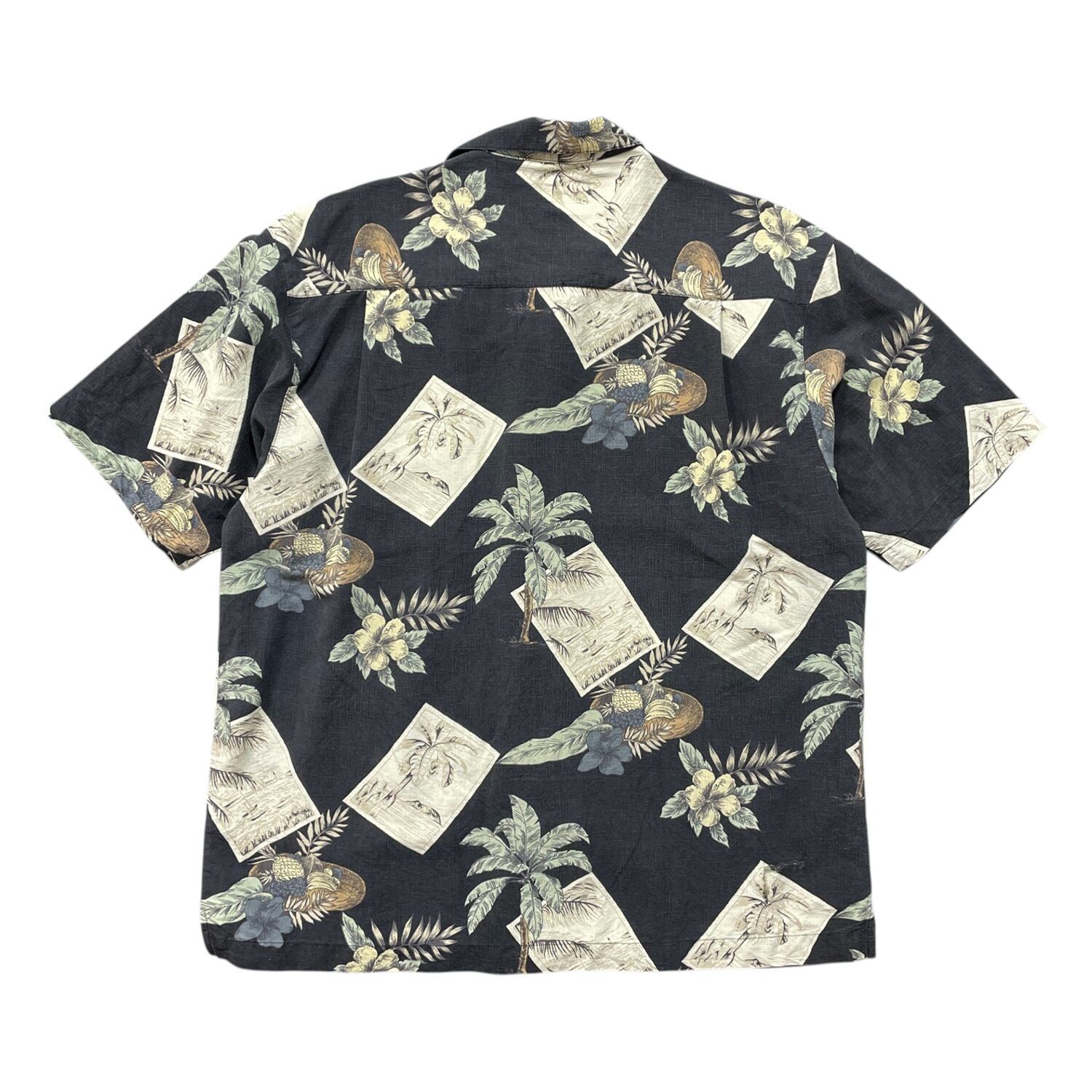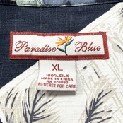 USA 古着 Paradise Blue パラダイスブルー シルク 開襟 アロハシャツ ハワイアンシャツ パームツリー柄 メンズXL ブラック BF4157