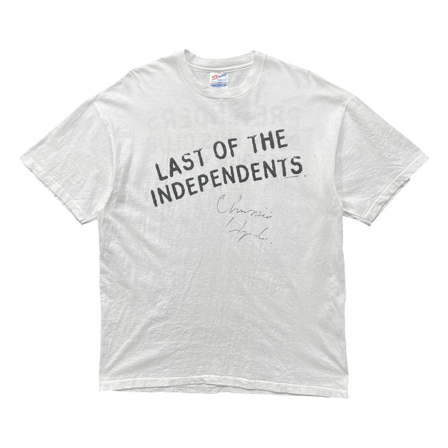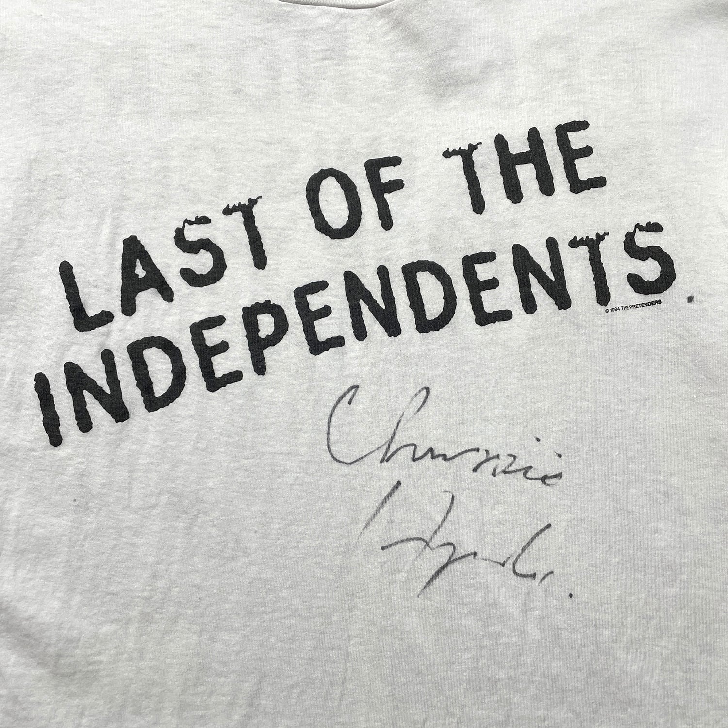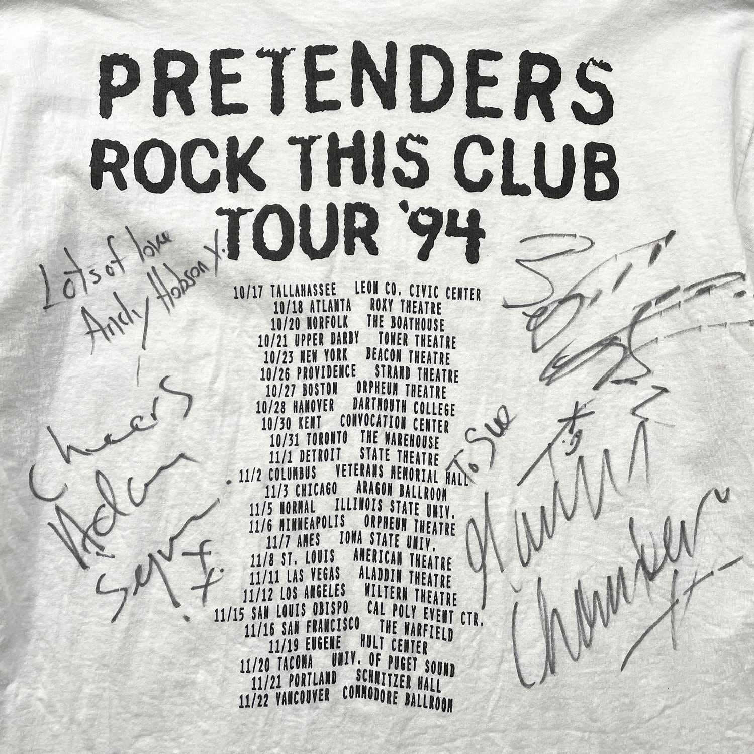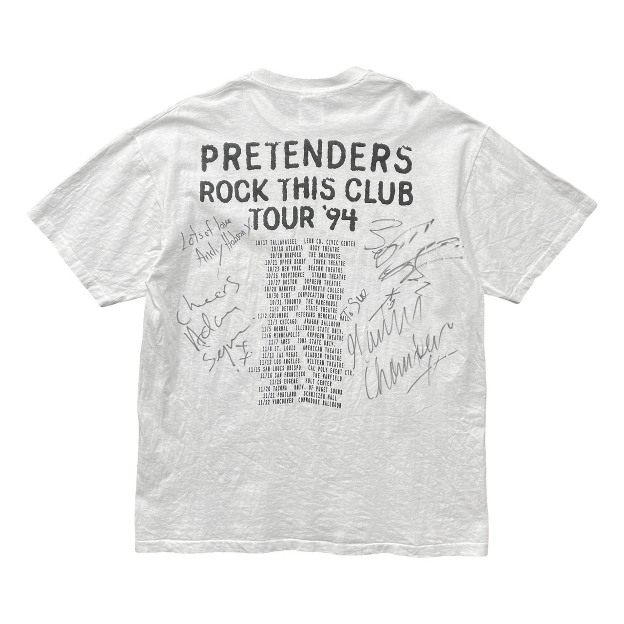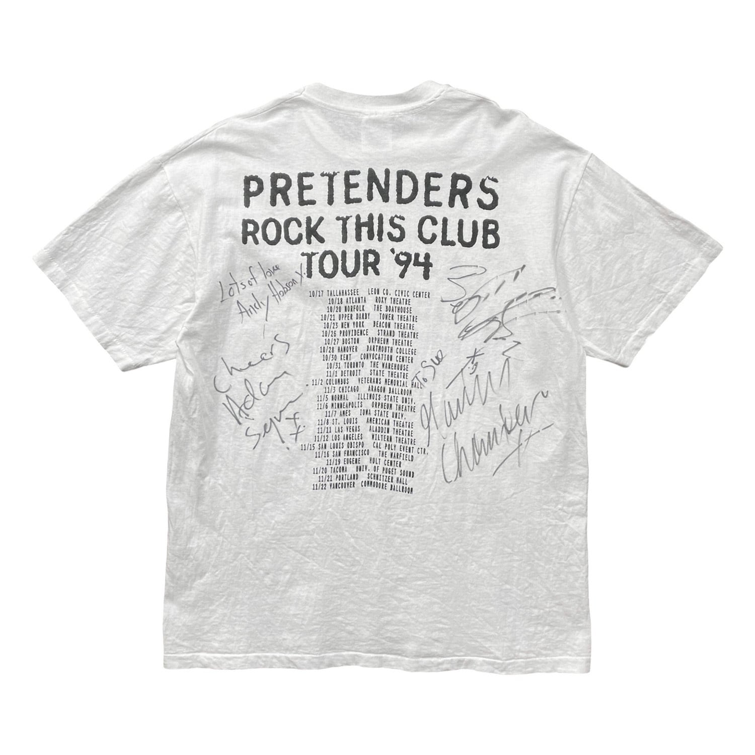 Andy Hobson(ベース)Adam Seymour(ギター)Martin Chambers(ドラム)Chrissie Hynde(ボーカル)のフルメンバーのサインが付いています。個人への宛名書き(To Sue)も確認できる貴重な当時のオリジナルです。コンディション良好で特に着用にも大きな問題はございません。
