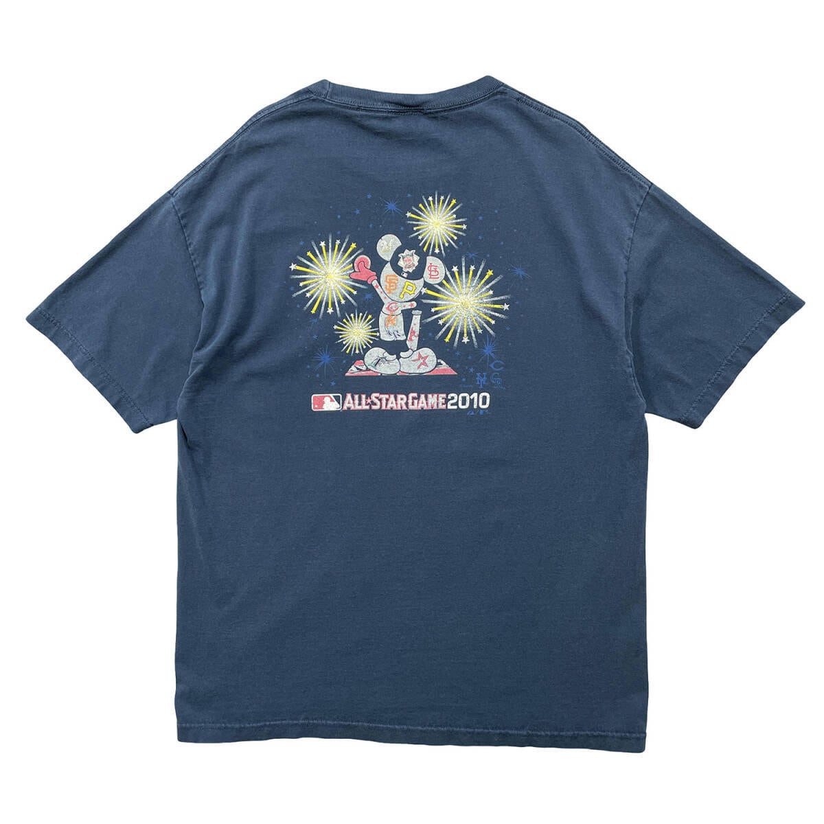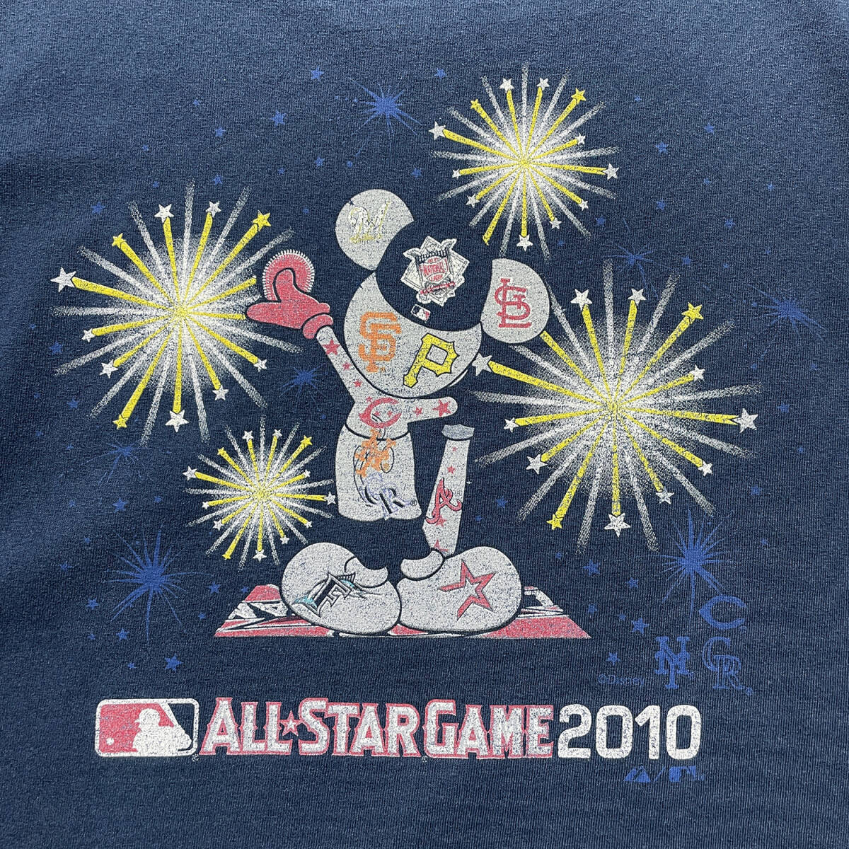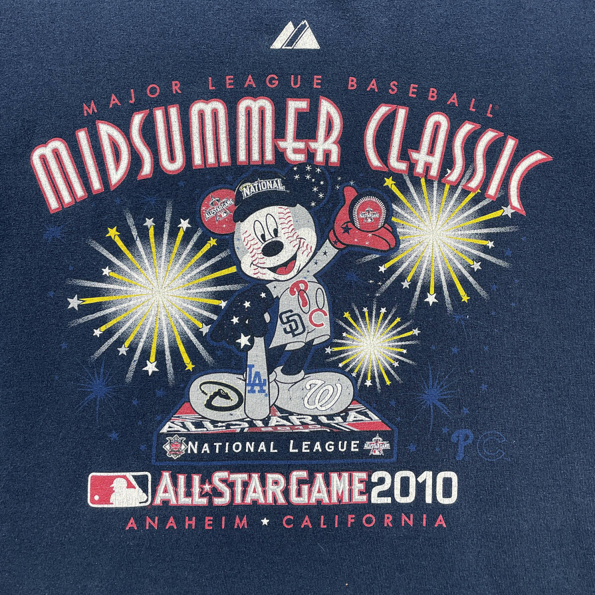 USA 古着 Majestic マジェスティック ディズニー MLB オールスターゲーム2010 ミッキーマウス Tシャツ プリント メンズL ネイビー BA5174