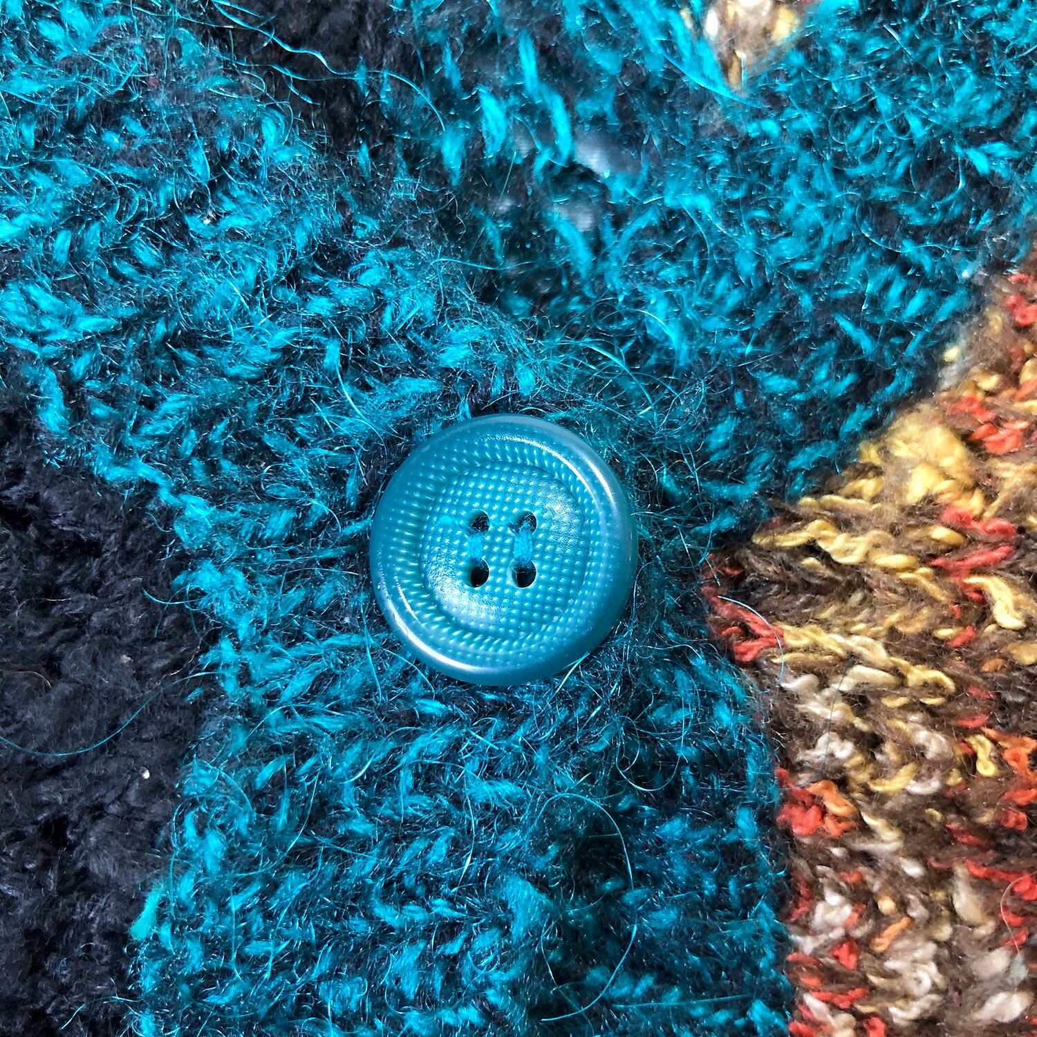 USA 古着 80S ヴィンテージ モヘア混合 デザインニット レザー貼り 総柄 カーディガン ワイドストライプ マルチ レディースM/L相当