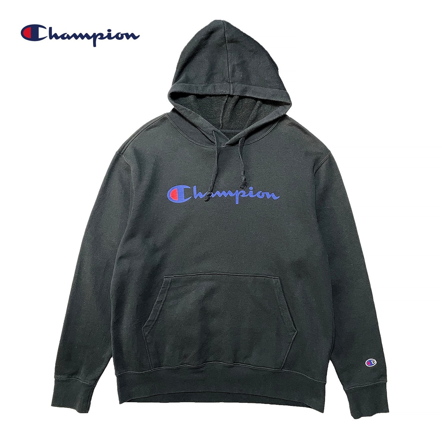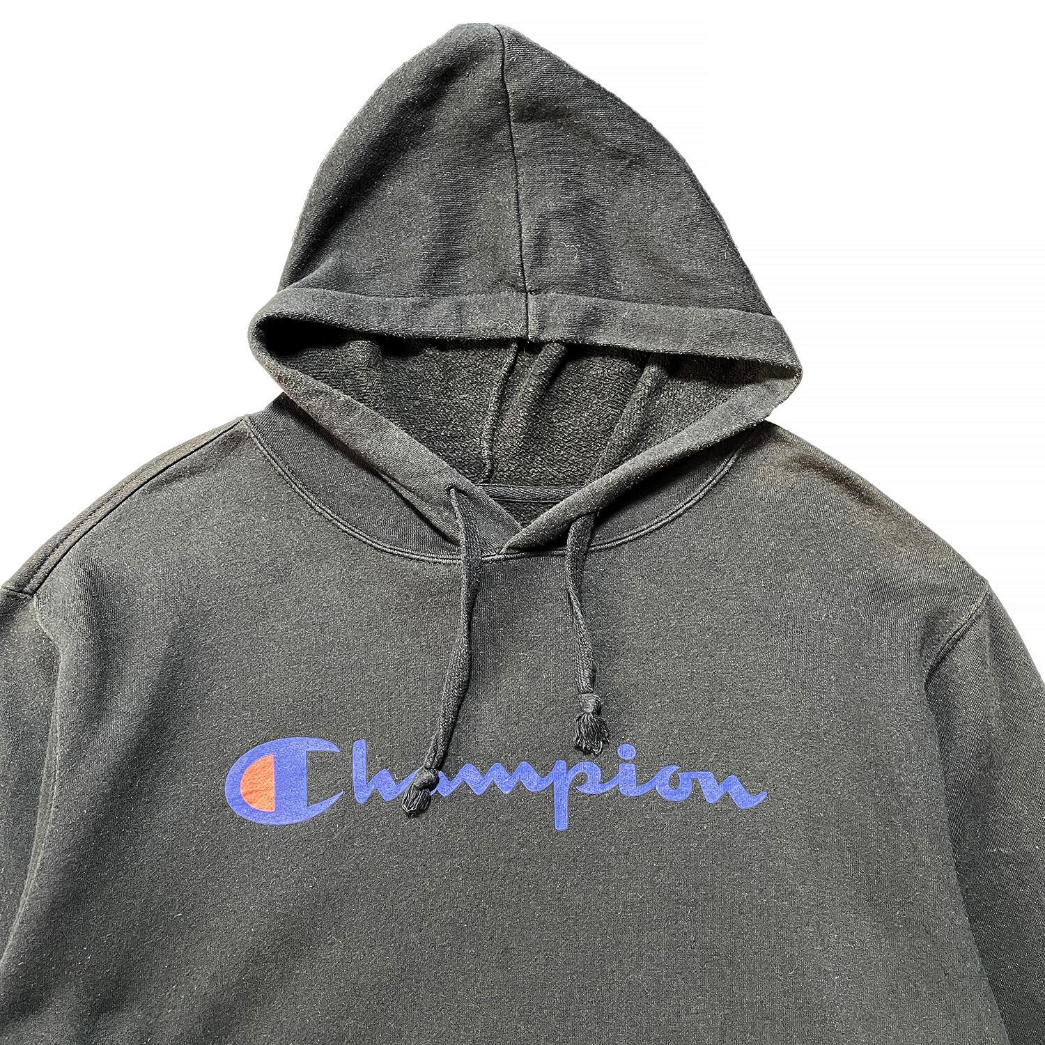 USA 古着 Champion チャンピオン ロゴプリント フーディー スウェットパーカ トレーナー メンズL ブラック 黒色 BE0779