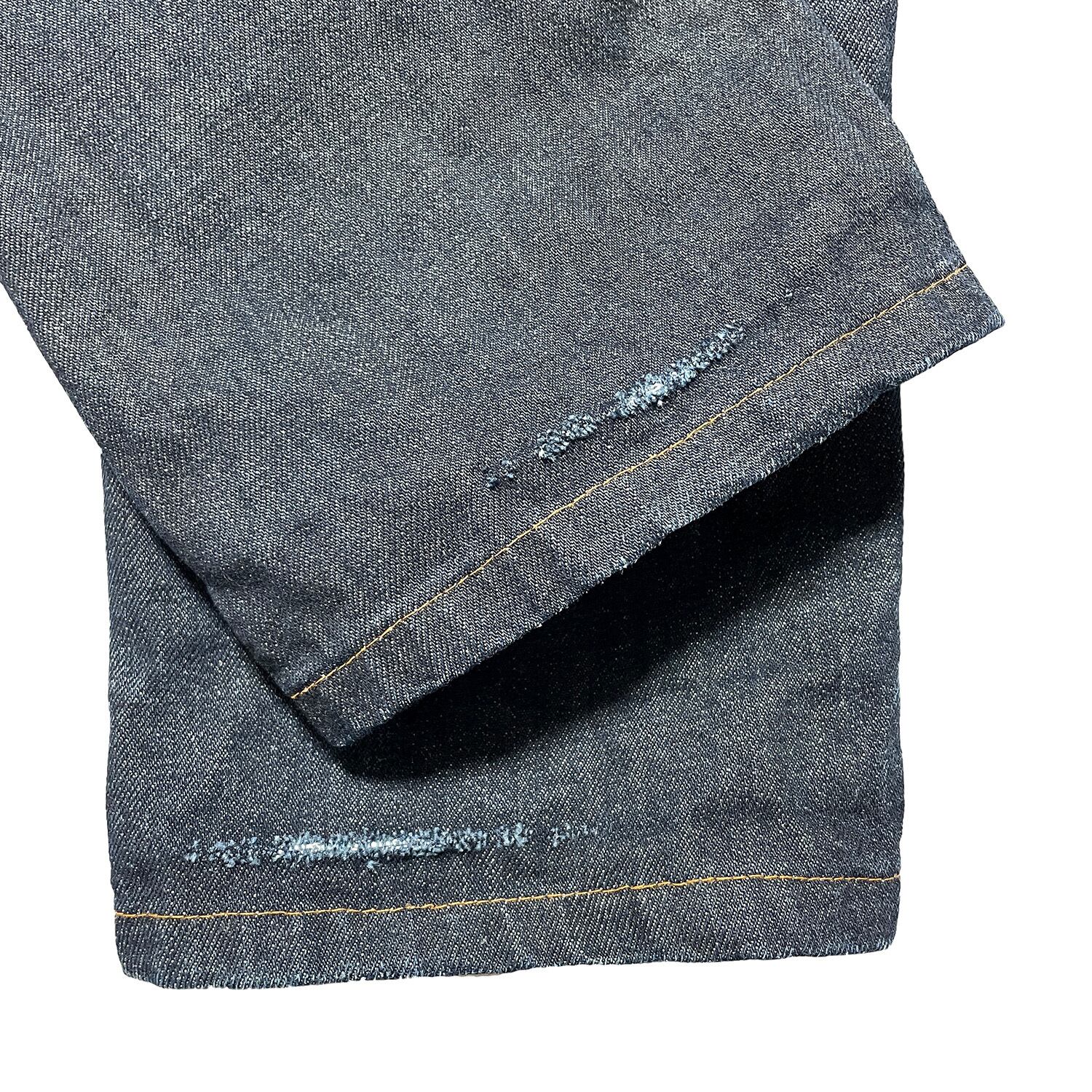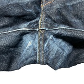 股の付け根付近にダメージのリペア箇所、裾に折り返した傷跡があります。